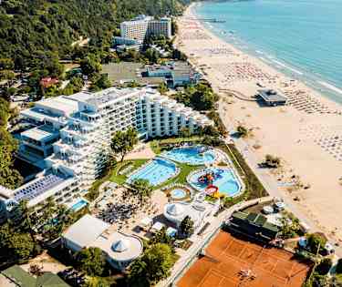Albenan upea hiekkaranta on kuusi kilometriä pitkä ja paikoin 100 metriä leveä. Matalapohjaisella rannalla on hyvin tilaa, tunnelma on rauhaisa ja vesi kristallinkirkasta. Tjäreborgin asiakkaat saavat maksutta käyttöönsä aurinkotuolit ja aurinkovarjot esittämällä hotellihuoneen avaimen (2 aurinkotuolia ja 1 aurinkovarjo per huone). Ensimmäisellä ja toisella rivillä sijaitsevista aurinkotuoleista ja -varjoista peritään lisämaksu. Rantaa kiertää autoton rantapromenadi, jonka äärellä voi syödä, juoda, ostaa hedelmiä, jäätelöä ja muuta hyvää. Tarjolla on myös yleisimpiä vesiurheilulajeja, kuten parasailingiä, polkuveneitä, purjehdusta ja vesiskoottereita.