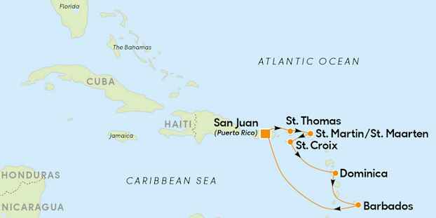 Barbados on kaikkea, mitä Karibialta voi toivoa; hyvää ruokaa, kauniita rantoja, rehevää luontoa sekä ystävällinen tunnelma. Barbados ei ole suuri saari, läpimitaltaan alle 50 kilometriä, mutta silti täällä on paljon nähtävää ja koettavaa. Rannikkoa pitkin on rantoja yksi toisensa jälkeen, aina etelärannikolla sijaitsevasta, purjelautailijoiden suosikista Silver Sands Beachistä pieneen ja rauhalliseen Paradise Beachiin länsirannikolla. Ja kaikkea siltä väliltä. Laiva ankkuroituu Bridgetownin satamaan, joka on vain muutaman minuutin taksimatkan päässä pääkaupungista. Bridgetown on juuri sopivan kokoinen, joten ehdit hyvin tutustua siihen päivän aikana. Voit myös tehdä retken esimerkiksi vanhoille sokeriplantaaseille. Mutta älä suunnittele liikaa, sillä Barbados on täynnä ihania yllätyksiä eikä koskaan voi tietää, kauanko missäkin vierähtää. Voit osallistua yhtäkkiseen krikettiotteluun, pysähtyä tienvarressa olevalle kojulle, jossa myydään vastagrillattua kalaa tai vierailla maailman vanhimmassa rommitislaamossa nimeltään Mount Gay.