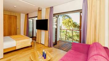 - Juniorsviitti koostuu yhdestä huoneesta, jossa on parivuode, ja loungealueella on sohva ja pöytä