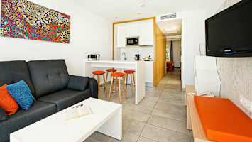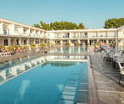 Apartamentos Laran viehättävällä allasalueella on kaksi uima-allasta, aurinkotuolit ja -varjot. Allasalueen yhteydessä on myös korotettu terassi, josta avautuvat näköalat meren suuntaan.