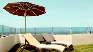 - Kaksi aurinkotuolia parvekkeella