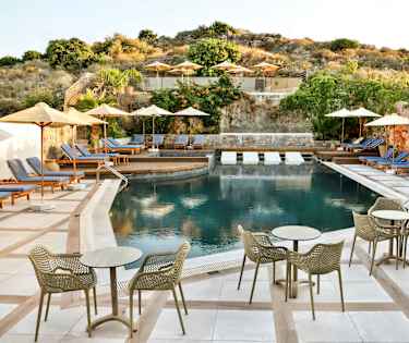 Elounda Oraman allasalueella on aurinkotuolit ja -varjot. Allasbaarista voit tilata virkistäviä juomia. Allasalue sijaitsee hotellin yläosassa, jonne pääset kätevästi hissillä.