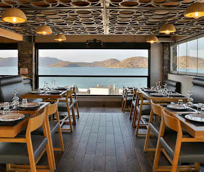 Elounda Oraman ravintolasta on upea merinäköala. Hotellissa on myös kaksi baaria, joista voit tilata viilentäviä juomia.