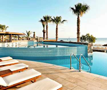 lähellä rantaa, ja hotellin allasalueelta avautuvat kauniit merinäköalat. Lisää luksusta lomailuun saat varaamalla huoneen, jossa on oma uima-allas, tai All Inclusiven, jolloin lomasi sujuu