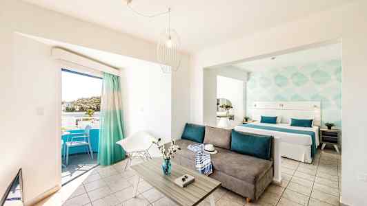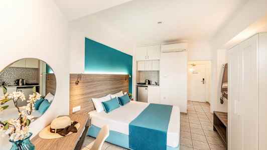 Lantiana Gardenin valoisissa ja hienosti sisustetuissa huoneistoissa on turkoosinsävyisiä yksityiskohtia.