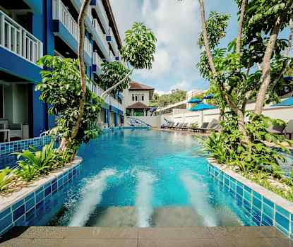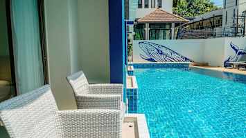 Kahden hengen huone, josta pääsy yhteiseen uima-altaaseen