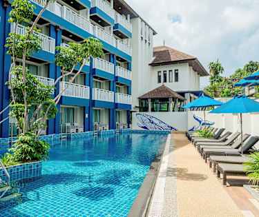 Kahden hengen huone ja parveke allasalueelle päin